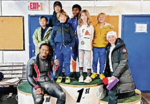 Full Throttle Speed Skating Team gathers after the Park Ridge Open in Chicago. Pictured are, front row from left, Duree Brown and coach Taylor Burdekin; middle row, Luis Marimoto Taqueushi, Christopher Schwab, Meredith Schwab, Gabe Marimoto Taqueushi; and back row, Vivaan Gupta and Rithwik Veeravalli. Not pictured is Wyatt Keifer.