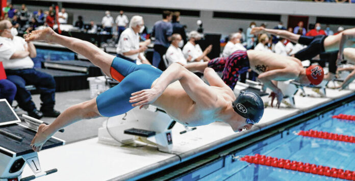 Columbus North’s Daniel Utterback takes off during the 200-yard freestyle consolation race at the Boys Swimming and Diving State Finals at the IU Natatorium in Indianapolis on Saturday, Feb. 26, 2022.