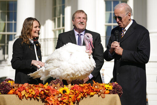 President Joe Biden pardons Chocolate, the national Thanksgiving turkey, at the White House in Washington, Monday, Nov. 21, 2022. (AP Photo/Andrew Harnik)