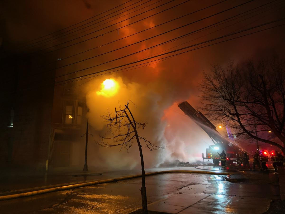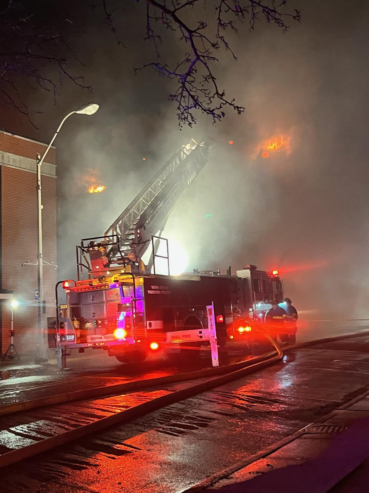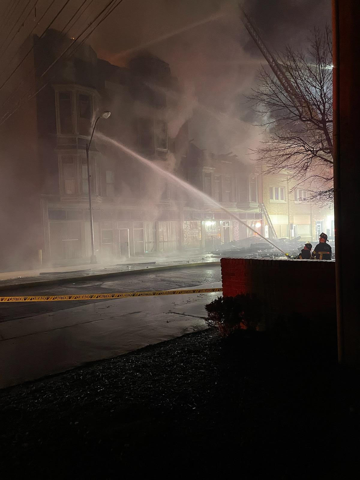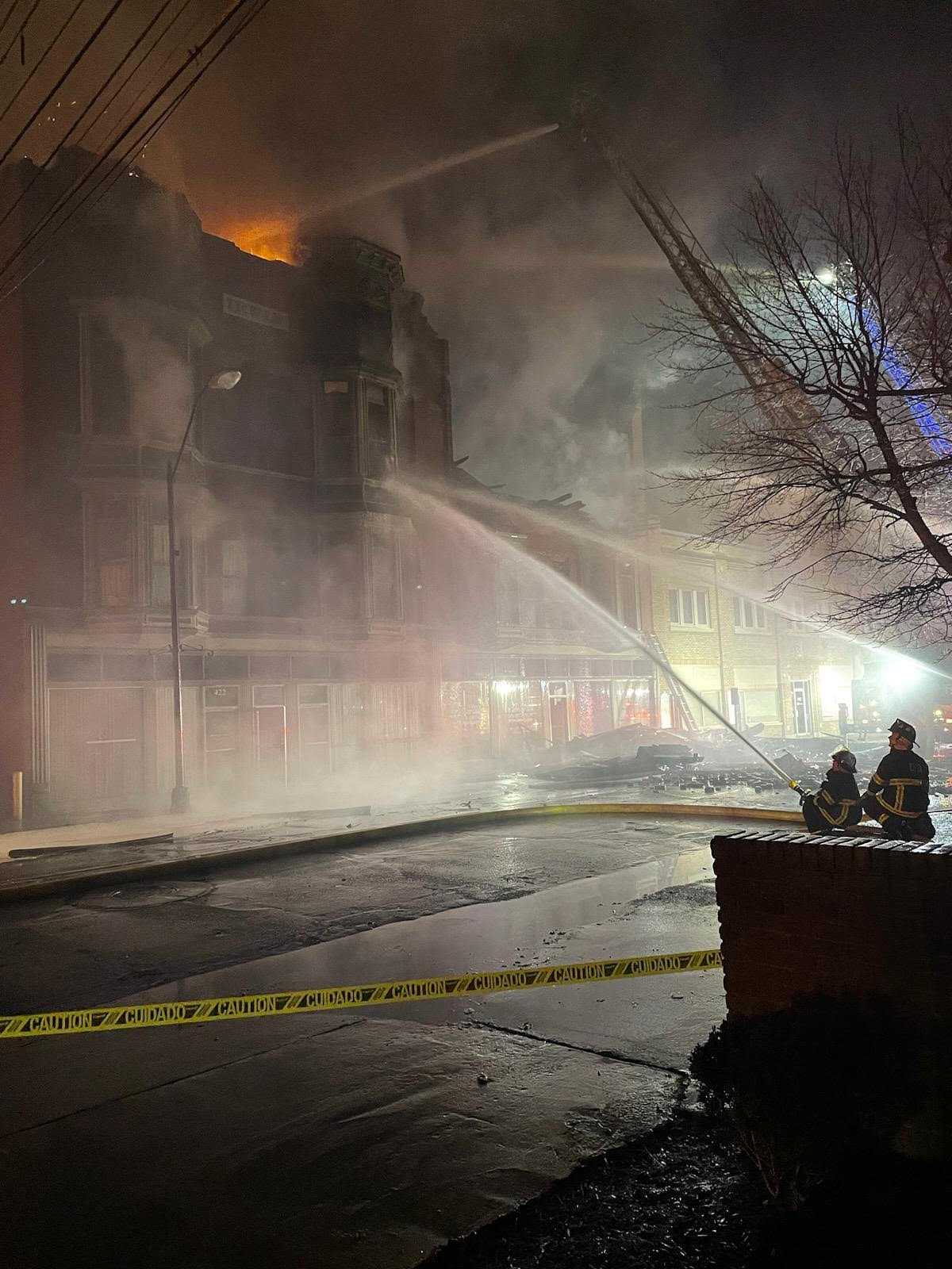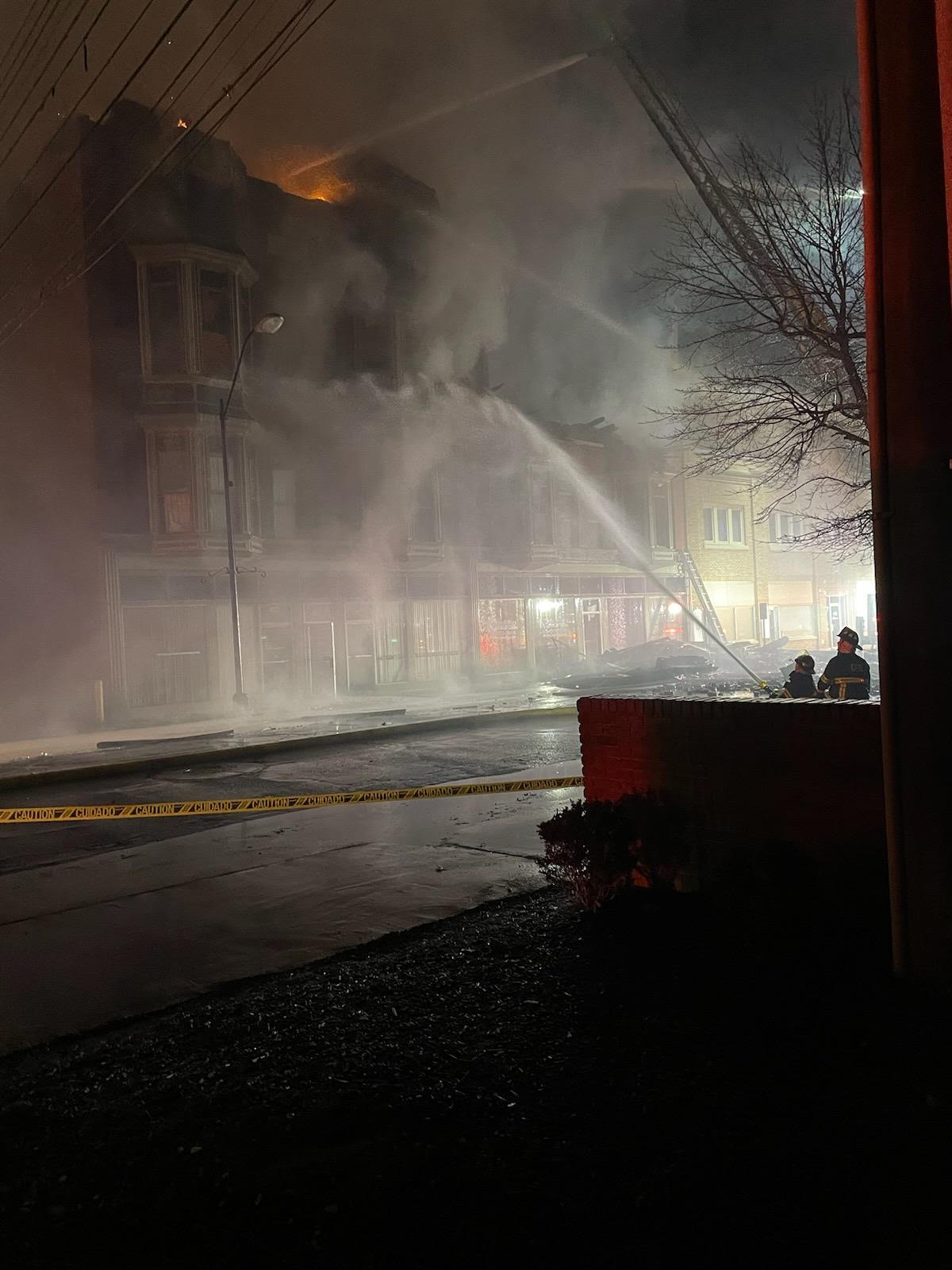 City officials reminded residents that the area remains a working fire scene, and with temperatures in the 28-degree range, a great deal of ice has formed on sidewalks and streets near the fire scene.