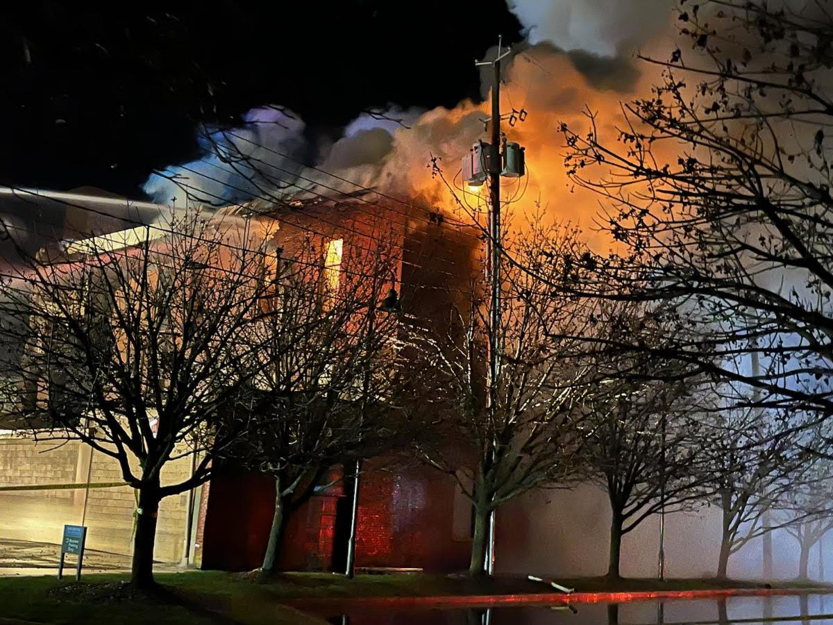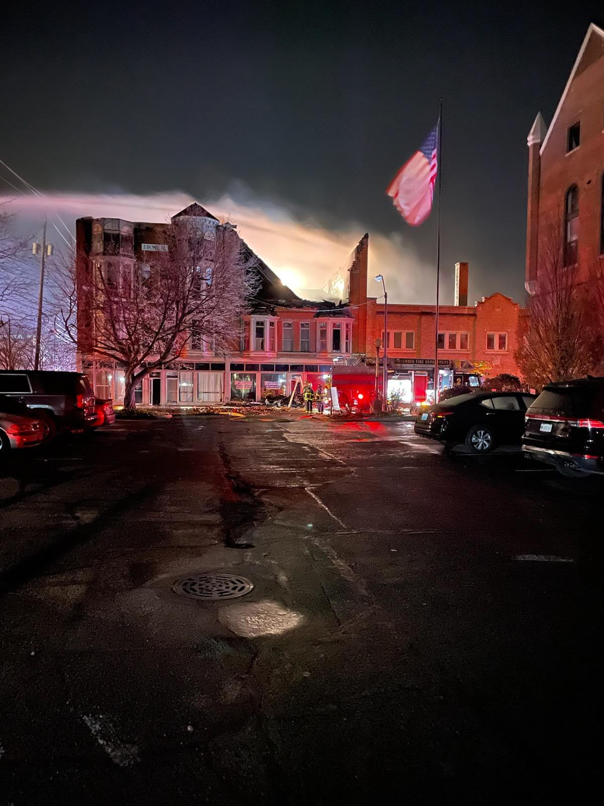 Capt. Mike Wilson, Columbus Fire Department spokesman, said the fire was reported at 11:50 p.m. and was fully involved when firefighters arrived. A portion of the building has collapsed into the rear parking lot, followed by a portion of the front of the building, which collapsed on Columbus Fire Department Engine 2 and its ladder, Wilson said.