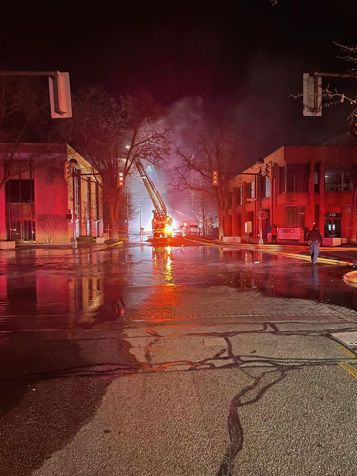 COLUMBUS, Ind. — Columbus firefighters continue to work at the scene of a fire at a commercial building in the 400 block of Fifth Street, involving structures at 440 Fifth St. and 422 Fifth St.