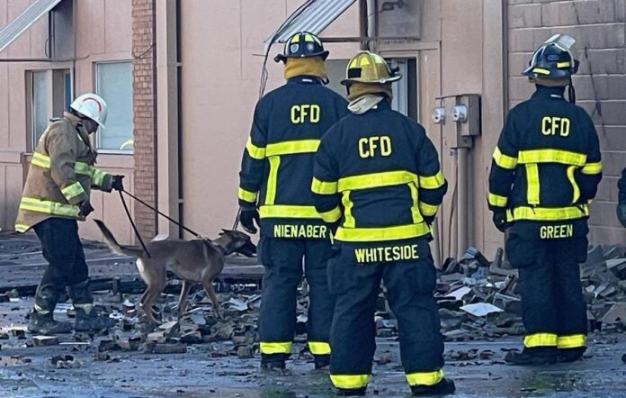 A cadaver dog was brought in by the state fire marshal’s office to detect if any human remains were in the structure, but the dog did not alert while searching the back of the building believed to be where the fire may have originated. A Columbus Police officer who arrived prior to firefighters took a photo of the back of the building on fire which had led firefighters to focus their investigation on that area.