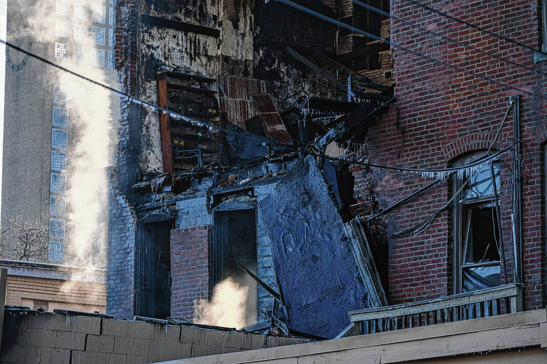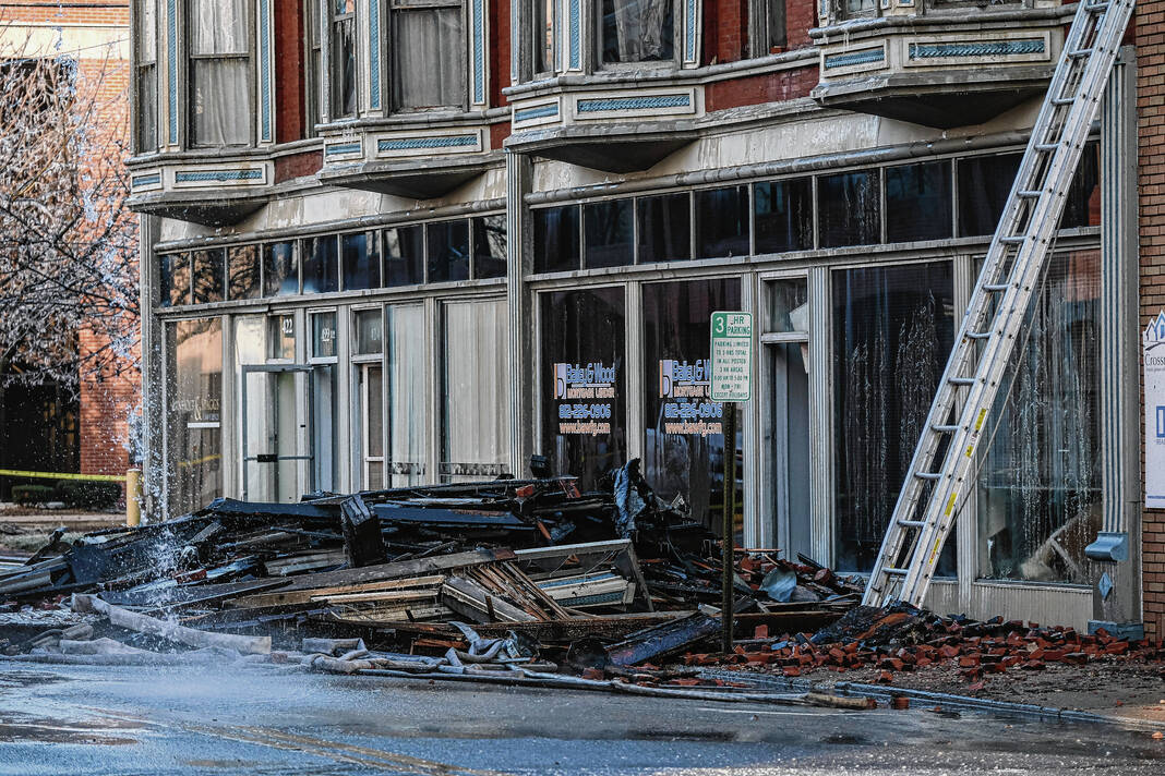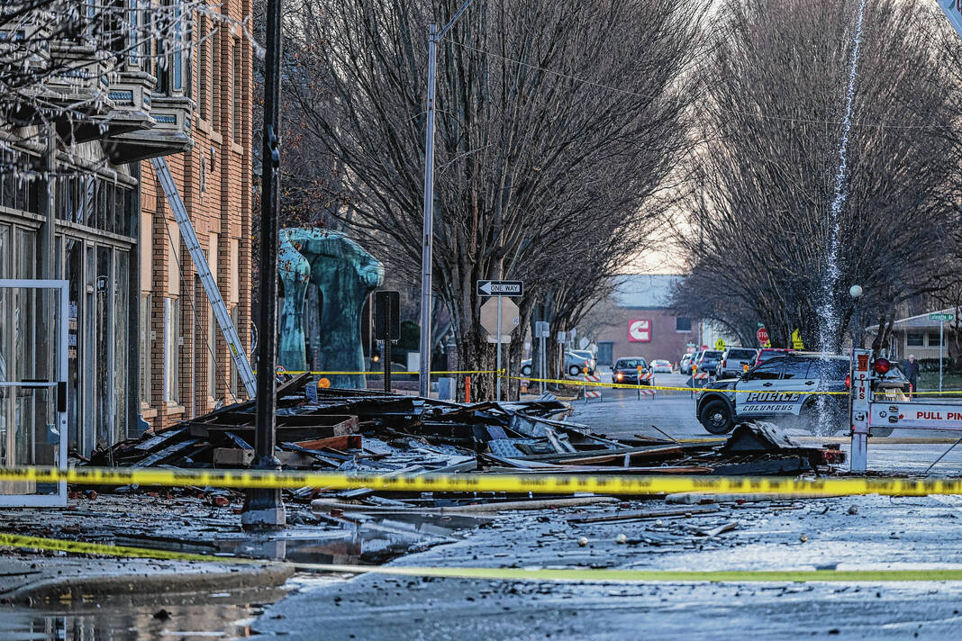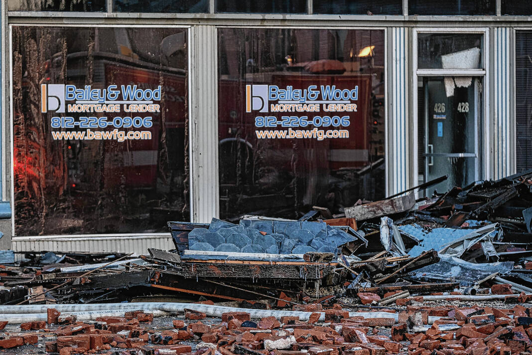 Mike Wolanin | The Republic A view of the aftermath of a large fire at 422 Fifth Street in downtown Columbus, Ind., Sunday, Dec. 4, 2022. The building partially collapsed due to the fire.