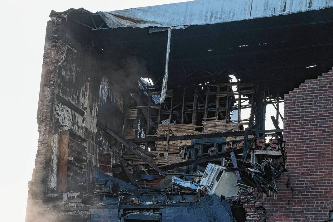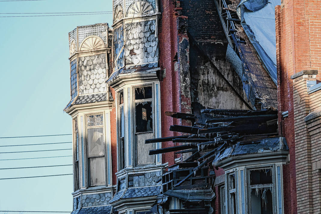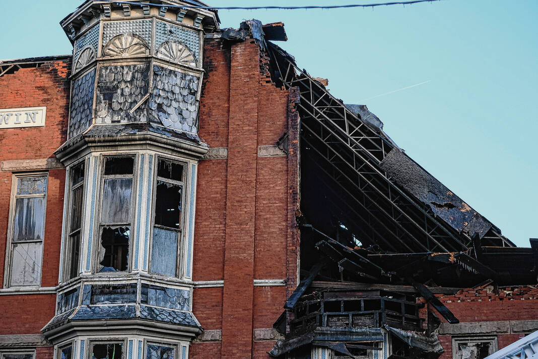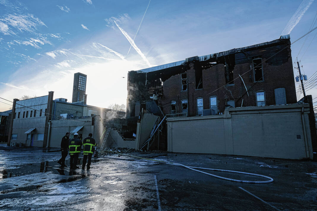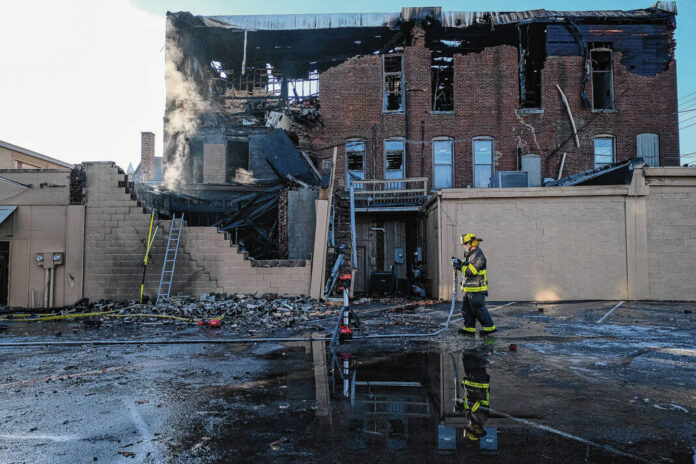 Mike Wolanin | The Republic A view of the aftermath of a large fire at 422 Fifth Street in downtown Columbus, Ind., Sunday, Dec. 4, 2022. The building partially collapsed due to the fire.