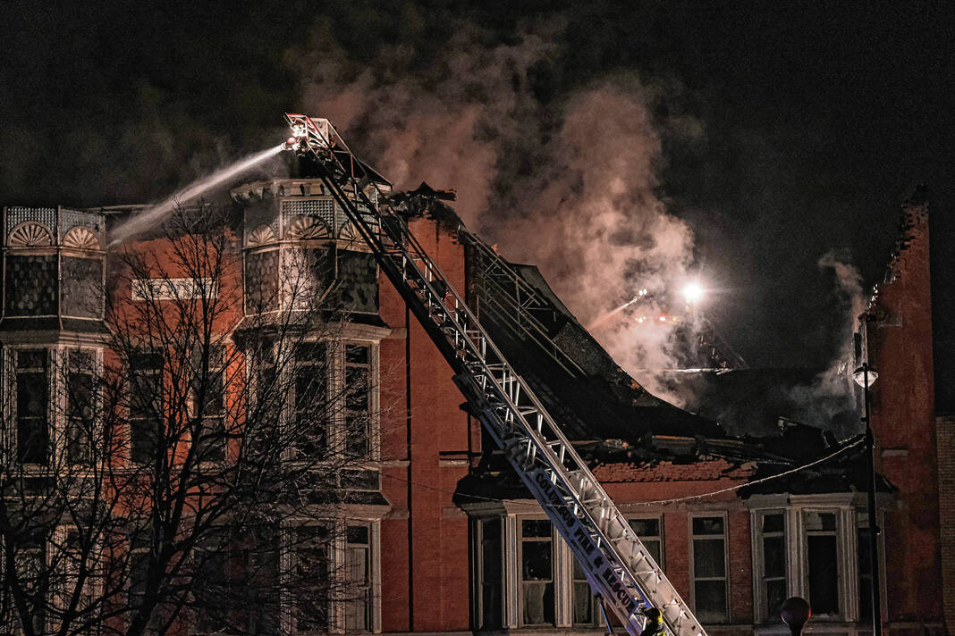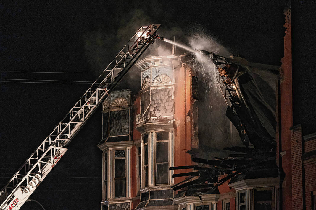 The iconic building, believed to date back to the early 1900s and known for its series of charming bay windows across two of the stories, was expected to be a total loss, with charred debris falling into the first floor and spilling out on to the sidewalk. It contained leased office space and photo studios and was not used for residential purposes, firefighters said.