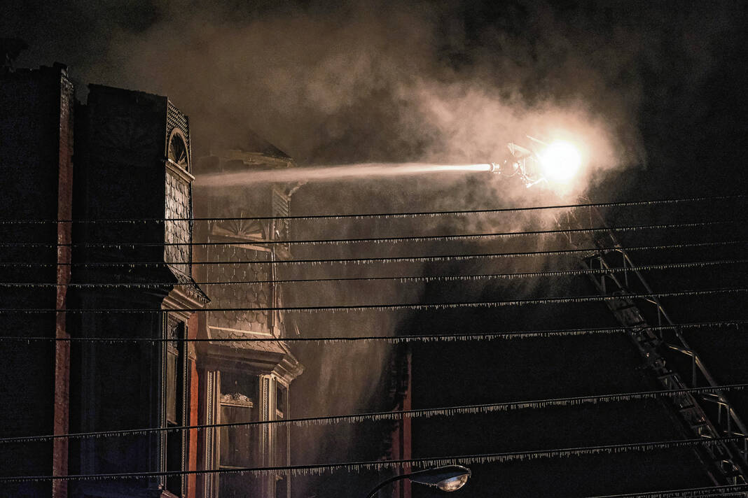 Utility officials shut off power to a portion of the downtown area as another precaution, and the lines quickly became encased in ice at the scene. Power was restored to all but the block affected by the fire by Sunday morning.