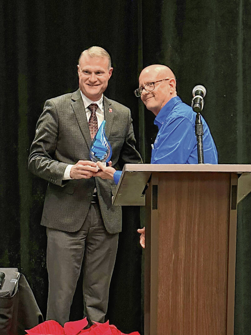 Photo provided Bartholomew Consolidated School Corp. Superintendent Jim Roberts receives the Candice Dodson Indiana EdTech Trailblazer Award from William Stein, director of information systems at MSD of Mt. Vernon (Evansville), who chairs the Indiana Chief Technology Officer Council.