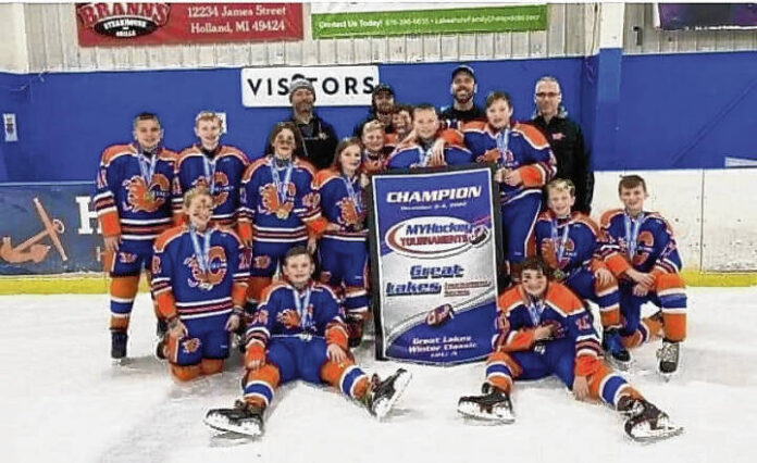 The Columbus Flames 10U team won its division in the Great Lakes Winter Classic last weekend in Holland, Michigan. Team members include, front row from left, Walter Meredith, Duncan Saner, Eliot Gill, Timo Bergmann; second row, Jonah Oliphant, Miles Gill, Luke Powers, Landon Neumann, Declan McGurk, Ronald Brumberg, Jada Thomas; and back row, coaches Stefan Bergmann, David Gill and Brian Neumann.