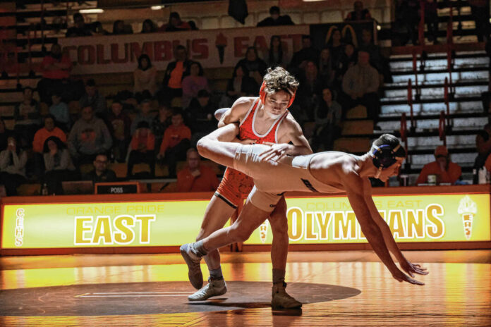 Columbus East’s Nate Anderson, left, competes against Brownsburg’s Jackson Gipson in a 132-pound weight class wrestling match Friday, Jan. 21. 2022 at Columbus East High School.