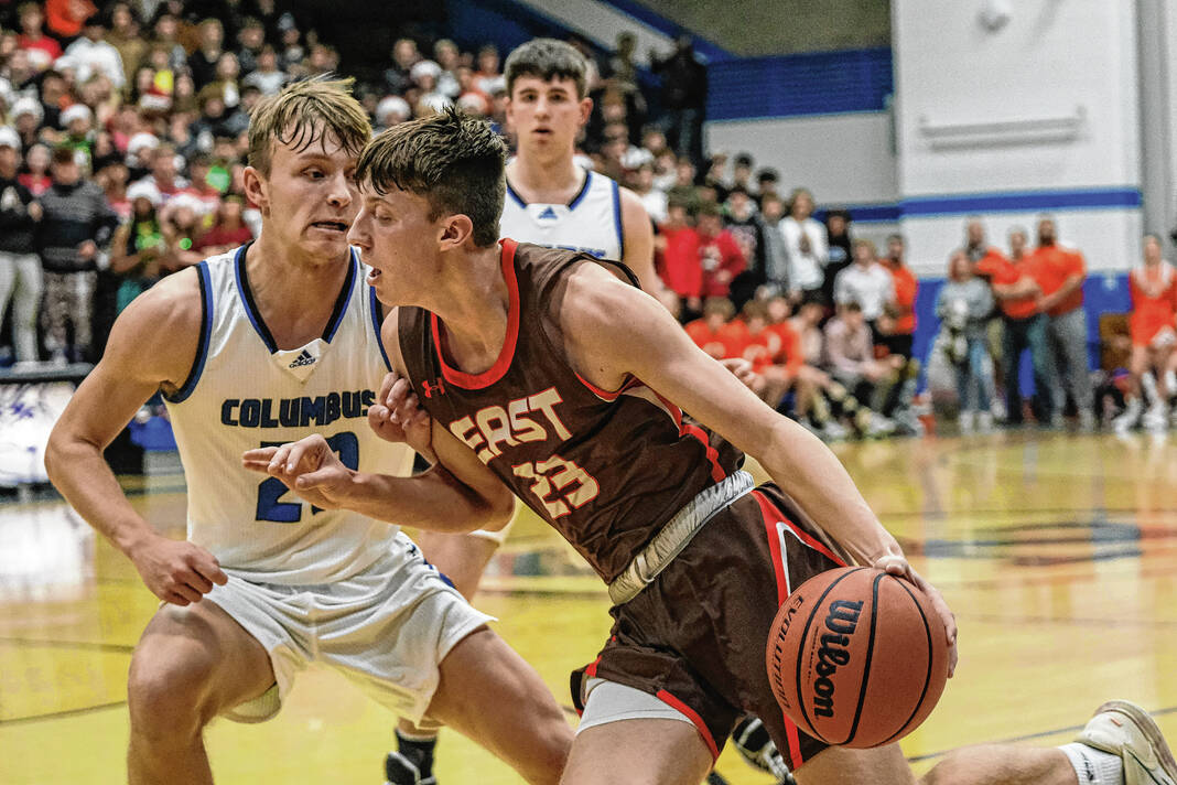 Columbus North’s Cooper Horn, right, dribbles past Columbus East’s Zane Moravec for a layup during the annual rivalry boys basketball game at Columbus North High School in Columbus, Ind., Friday, Dec. 16, 2022.