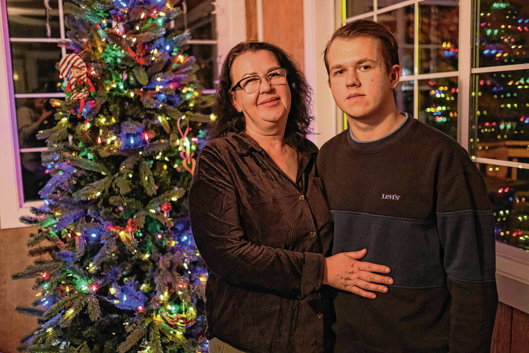 Mike Wolanin | The Republic Ukrainian refugee Oksana Bondar and her son, Columbus East High School exchange student Ivan Bondar, pose for a photo earlier this month at the home of host family Alex and Arina Machavariani in Columbus.