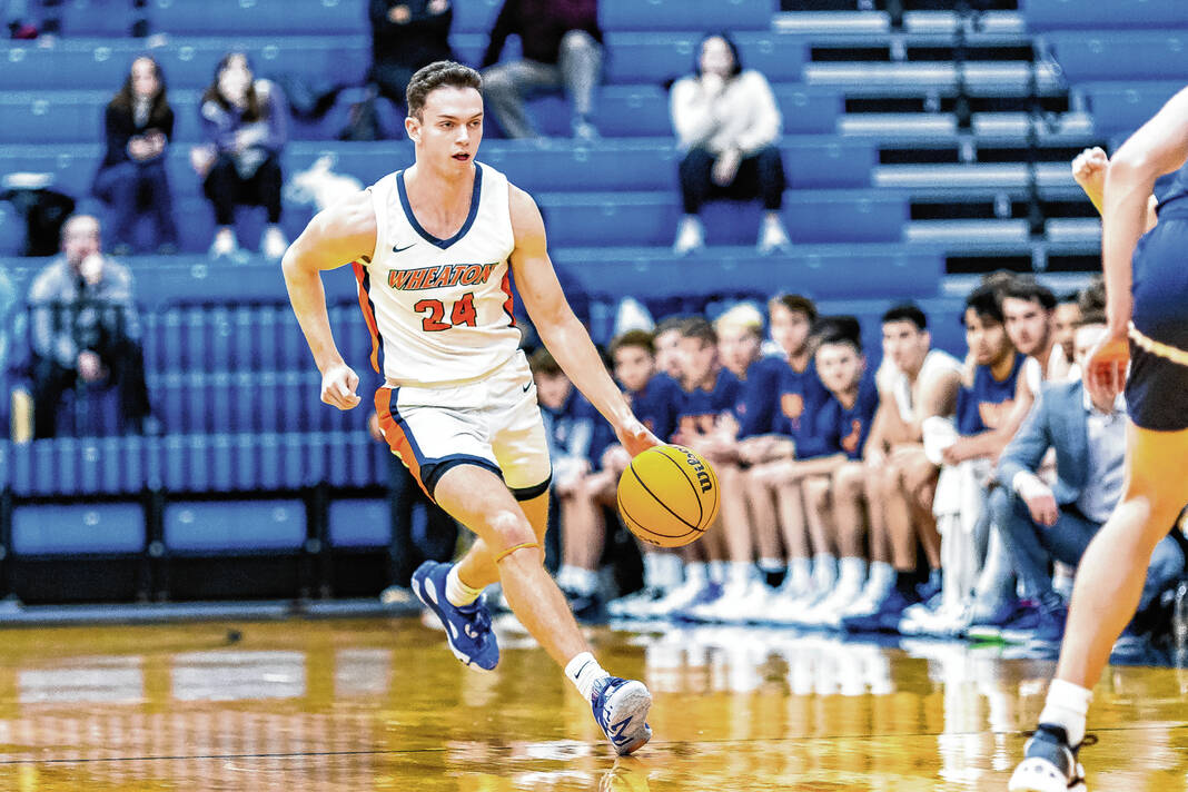 Wheaton guard Nick Schiavello brings the ball up the floor during the championship game of the Lee Pfund Classic against John Carroll at King Arena on Saturday, November 19, 2022.