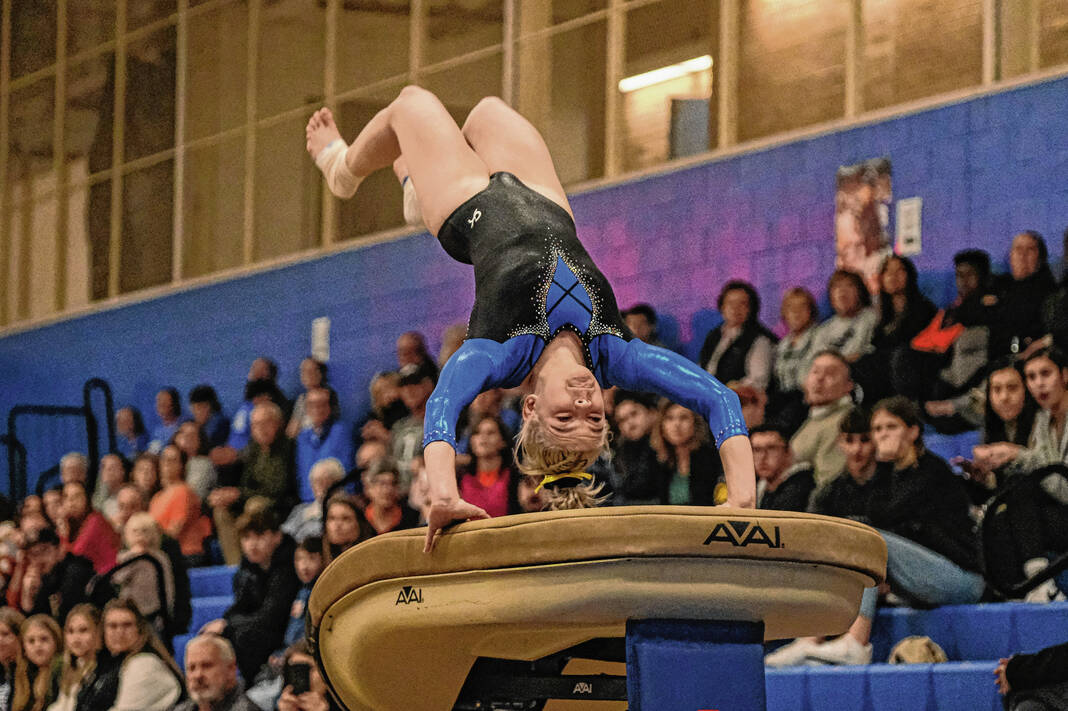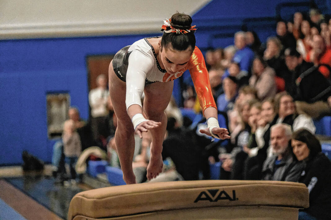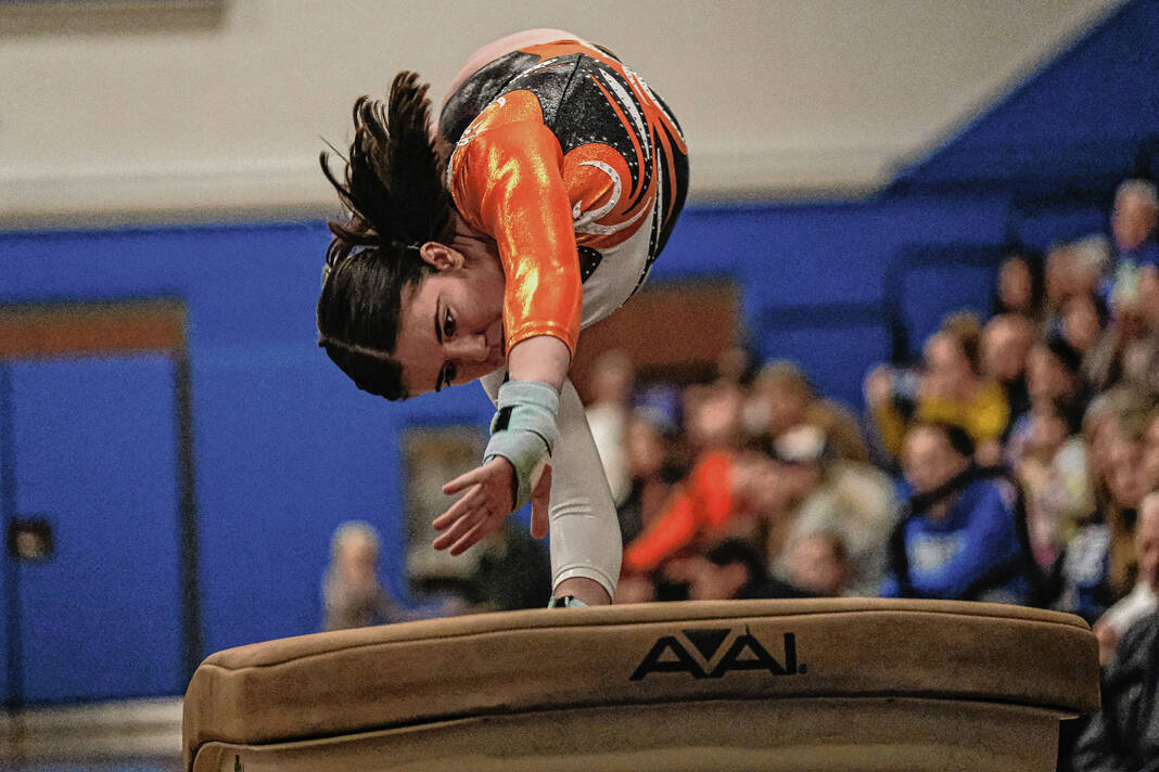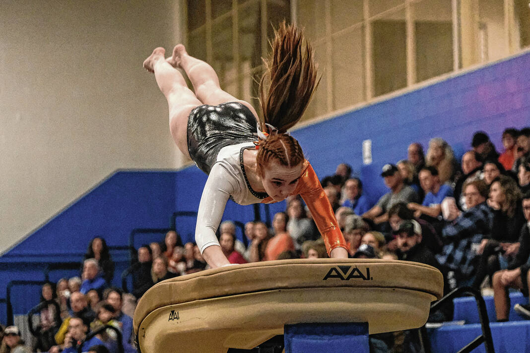 Columbus North’s Reese Euler competes on the vault in a gymnastics meet against Columbus East at Columbus North High School in Columbus, Ind., Monday, Jan. 9, 2023.