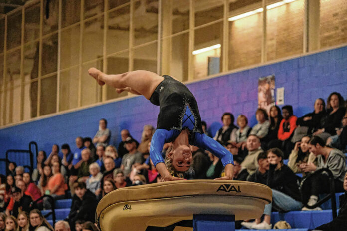 The Bull Dogs had three different winners in the four individual events, and those three gymnasts claimed the top three spots in the all-around competition. Sophomore Reese Euler won the vault (9.4) and floor (9.1) and took second on the bars (8.425) and third on the beam (7.65) on her way to winning the all-around with a 34.575.