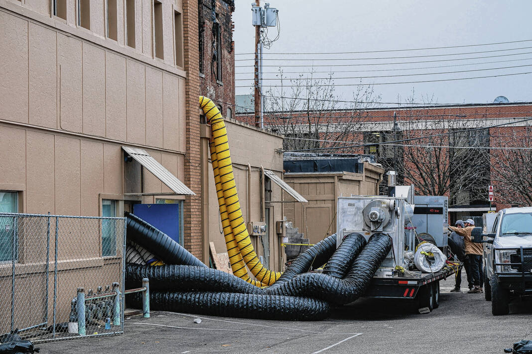 Mike Wolanin | The Republic A view of restoration and recovery efforts at the Columbus Area Chamber of Commerce building in Columbus, Ind., Wednesday, Jan. 11, 2023. The building was damaged by water due to efforts by firefighters to control the fire at the neighboring Irwin Block building.