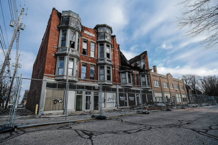 The Fifth Street block in front of the building, and the rear of the building that faces an alley have been fenced off since the fire occurred.
