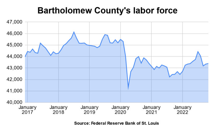 At the same time, the the local labor force in December continued to be significantly lower than pre-pandemic levels. Last month, Bartholomew County’s labor force stood at 43,738, up from 42,442 in December 2021 but down from 45,418 in December 2019, before the pandemic struck.