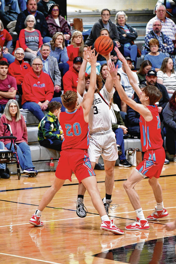A layup from the Jets’ Gavin Keller made it 53-50 with about 1:30 left in the game. On the ensuing possession, the Eagles (11-9) played keepaway to chew up a lot of clock, making Hauser (8-10) forced to foul. Seth Drockelman hit two free throws to make it 55-50.