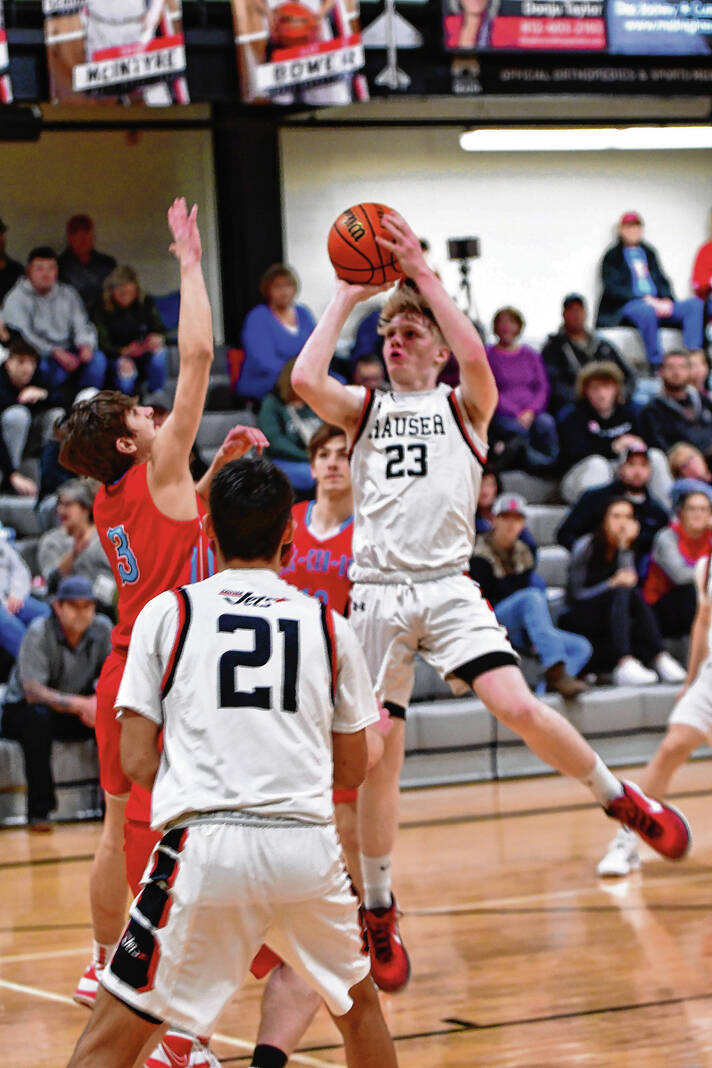 Hauser’s Jake Barriger shoots over Jac-Cen-Del’s Johnny Newhart Friday at Hauser High School.