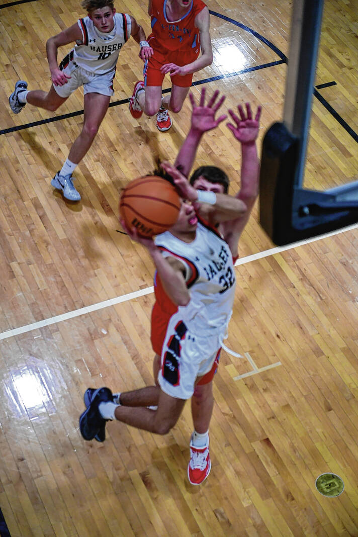 After a 3-pointer from Devin Grieshop gave Jac-Cen-Del a 20-11 lead, a Kameron Blair 3-point-play capped a Hauser 5-0 run to make it 20-16.