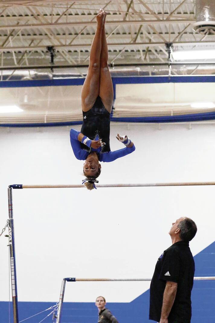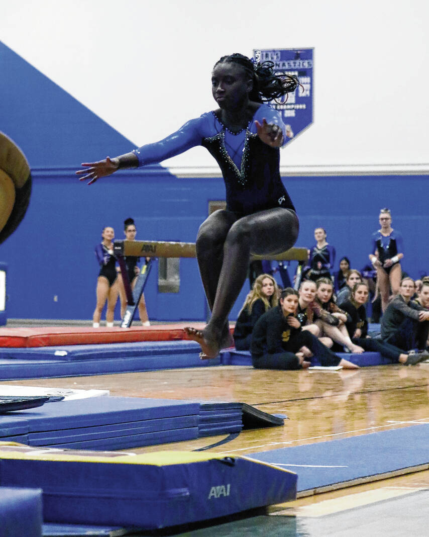 Monday’s Conference Indiana meet was tied between the Bull Dogs and Bloomington North heading into the final apparatus, with Columbus North on the floor and the Cougars on the beam. The sixth-ranked Bull Dogs edged out No. 7 Bloomington North 109.0 to 108.35 to claim the championship. Bloomington South was third with a 103.7.
