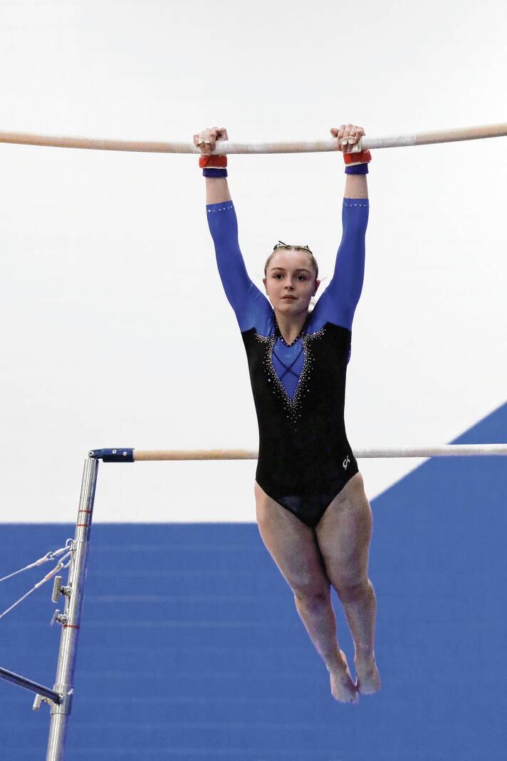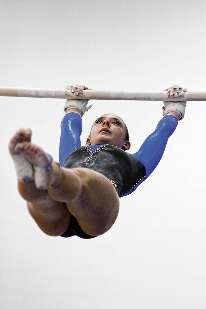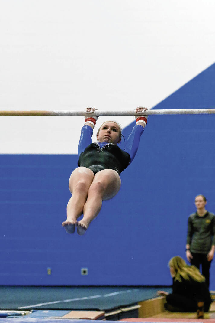 Columbus North’s Reese Euler competes on the bars in the Conference Indiana meet at Columbus North, Monday, Feb. 13, 2023.