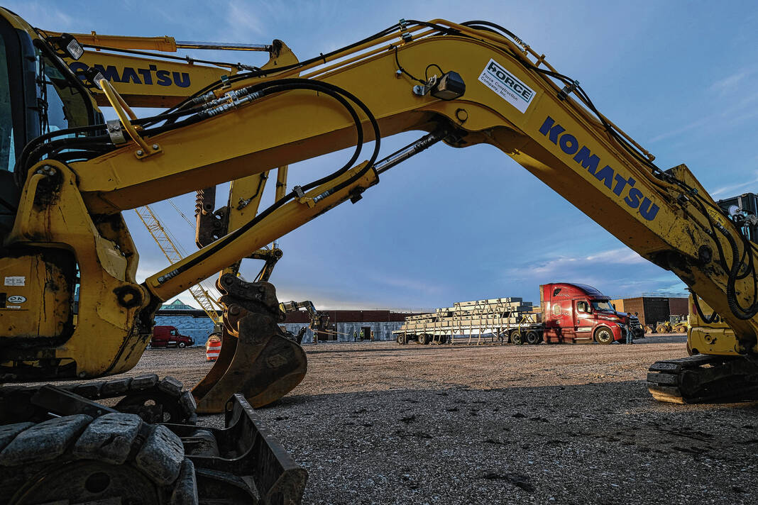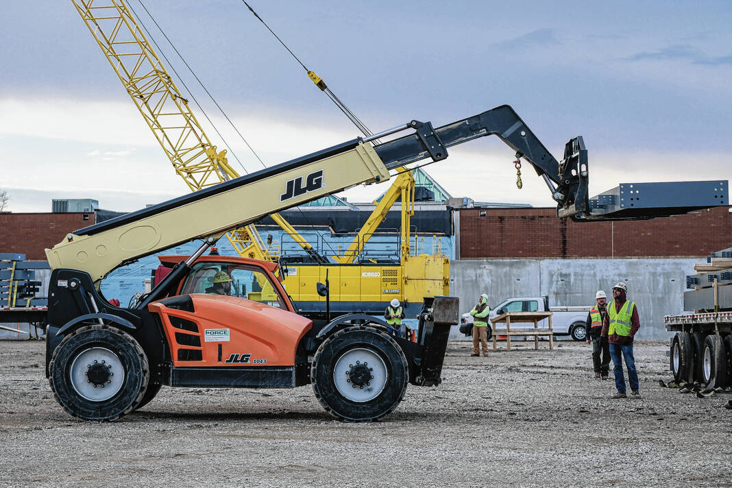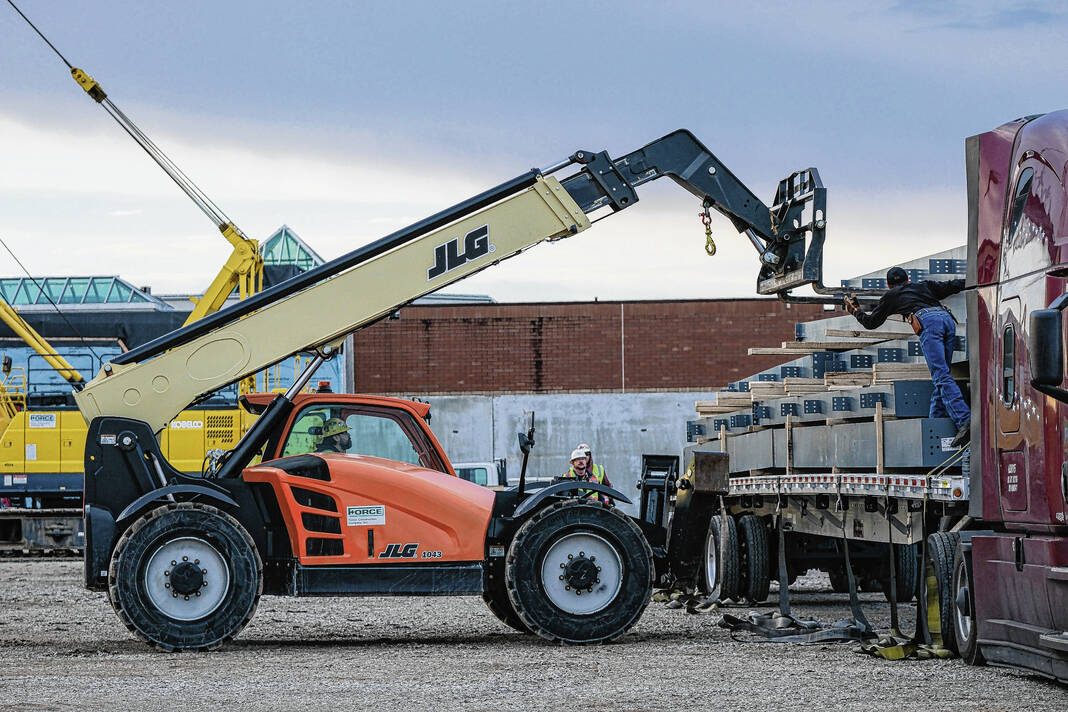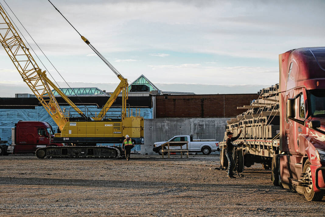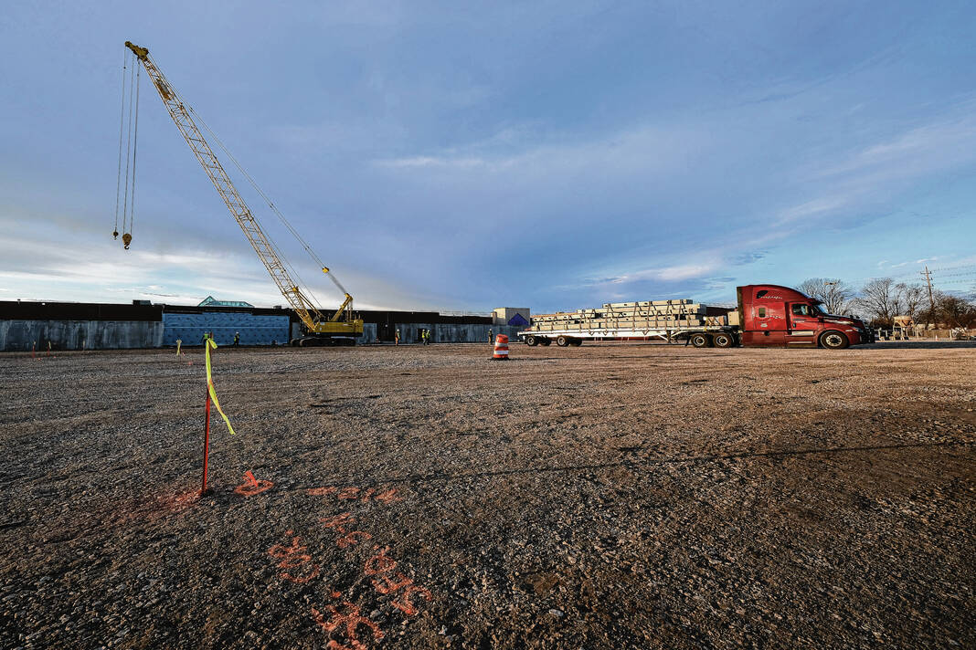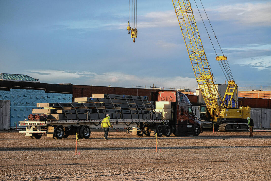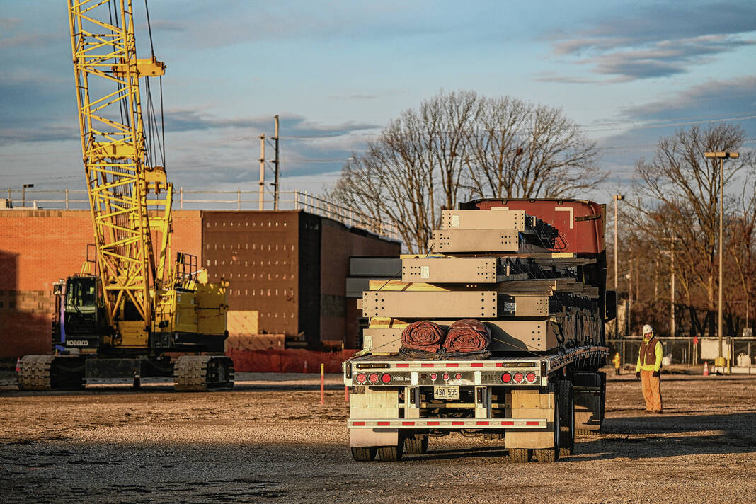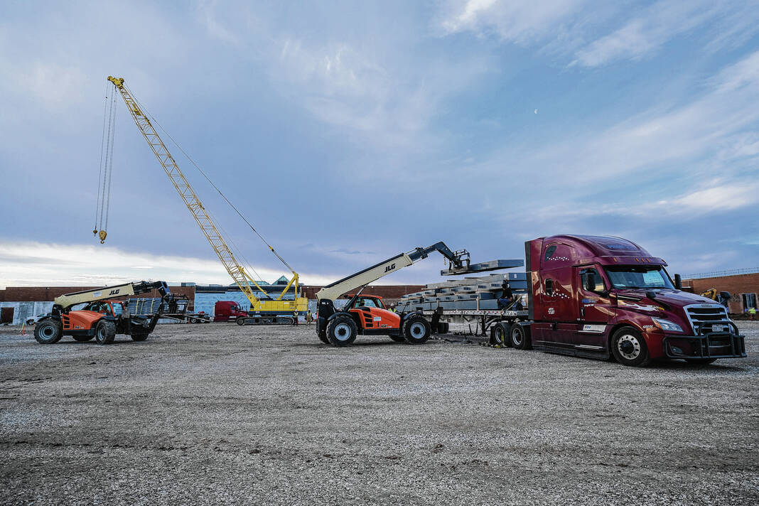 Mike Wolanin | The Republic The first shipment of steel for the Circle K Fieldhouse is unloaded at NexusPark in Columbus, Ind., Monday, Feb. 13, 2023.