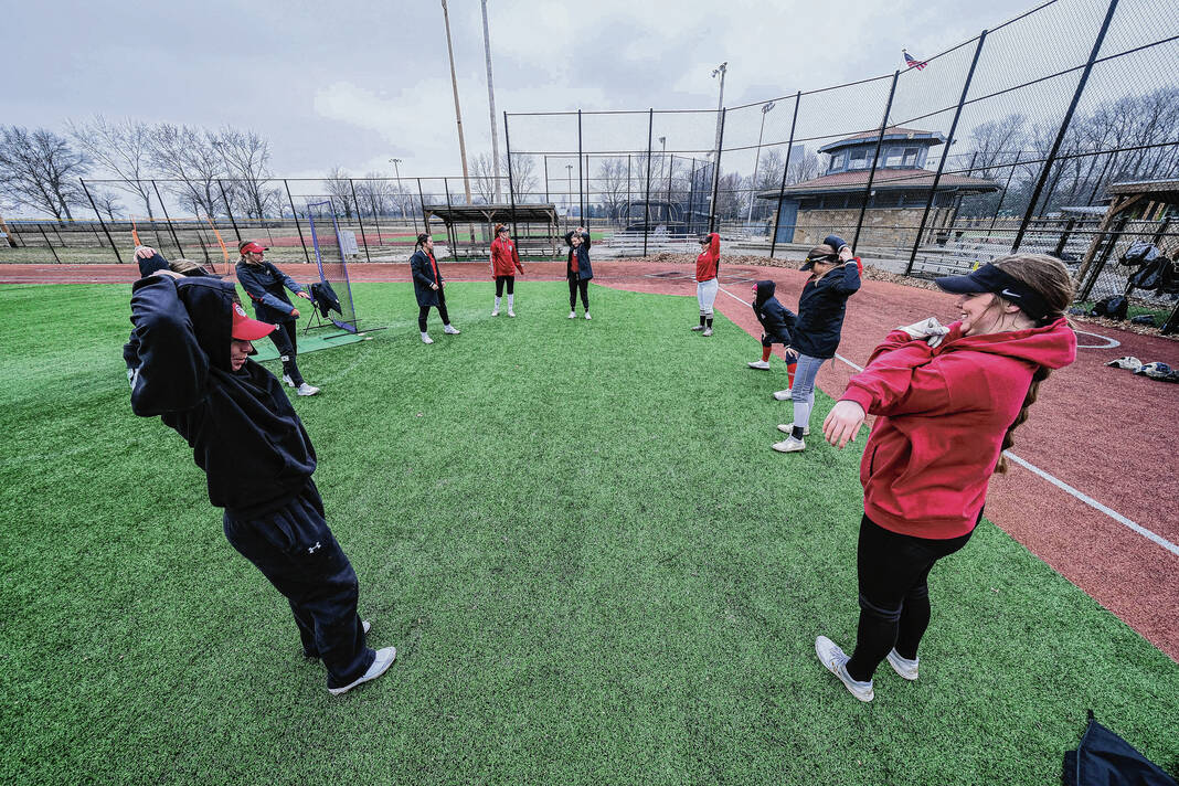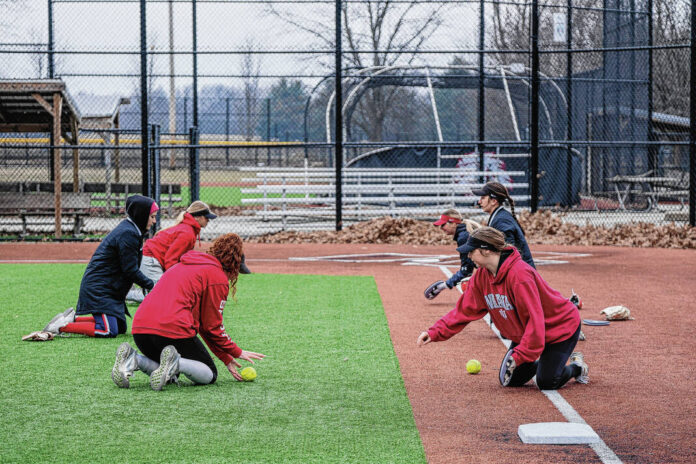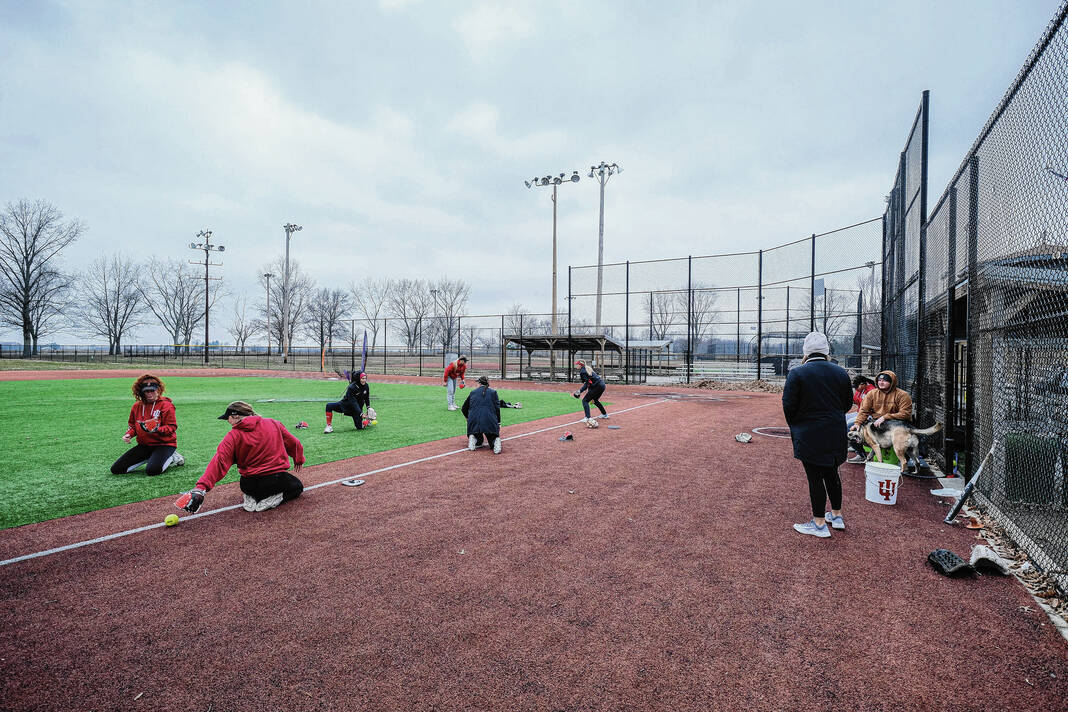 IUPUC softball players warm up with some fielding drills during practice at Ceraland in Columbus, Ind., Friday, Feb. 10, 2023.