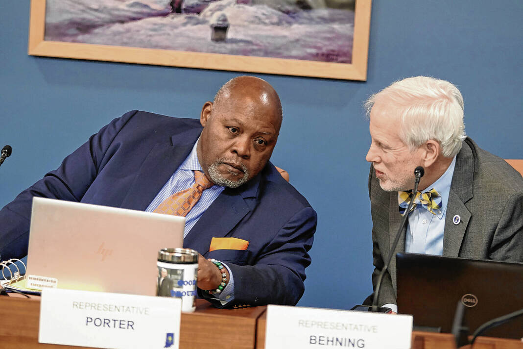 Monroe Bush for Indiana Capital Chronicle Rep. Greg Porter, D-Indianapolis, listens to a colleague earlier this session in an earlier committee hearing at the Statehouse.
