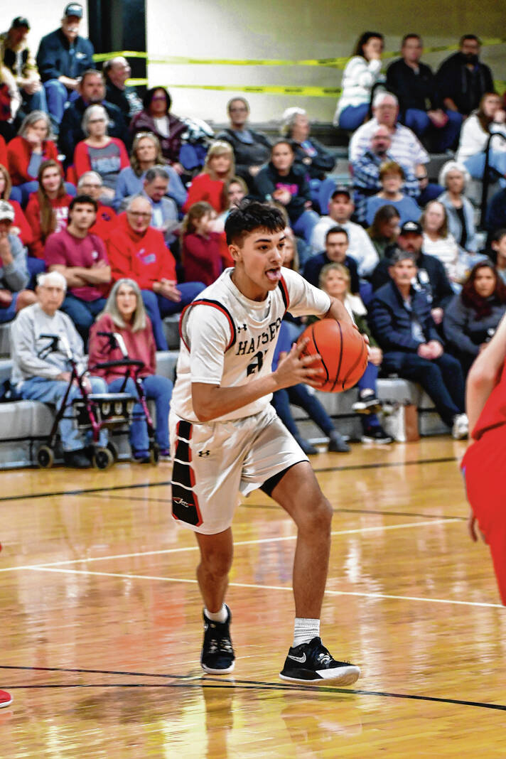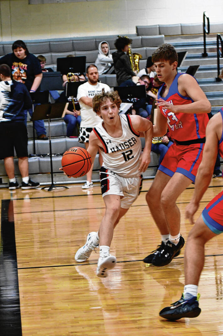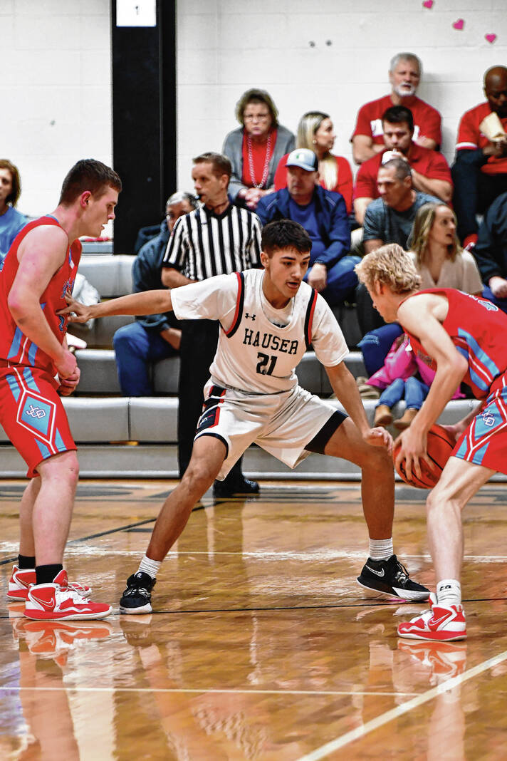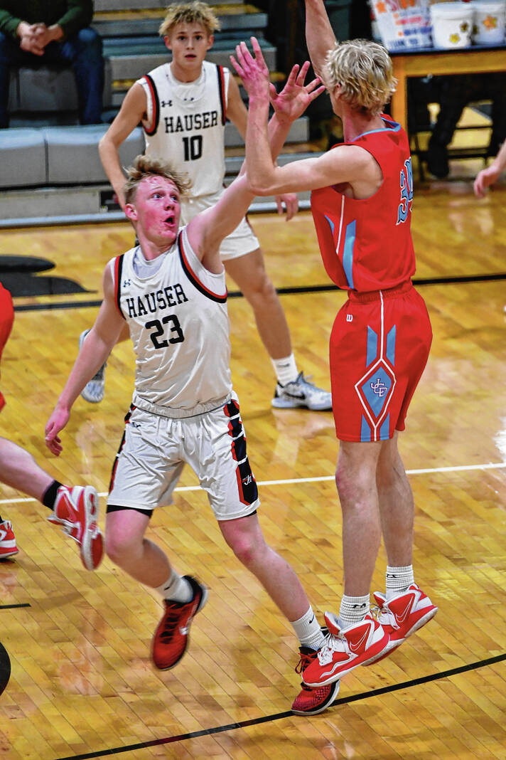 Hauser’s Stryker Gill drives against North Decatur’s Lance Nobbe Jan. 6 at Hauser High School.