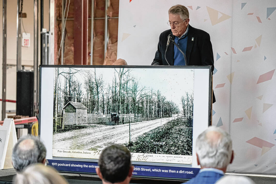 Mike Wolanin | The Republic Columbus Mayor Jim Lienhoop talks about the history of the NexusPark site during the NexusPark groundbreaking ceremony at NexusPark in Columbus, Ind., Wednesday, Feb. 8, 2023. The photo below Mayor Lienhoop shows 25th Street and the gate leading to the Bartholomew County Fairgrounds in 1911. The Bartholomew County Fairground used to occupy the site where NexusPark is located.