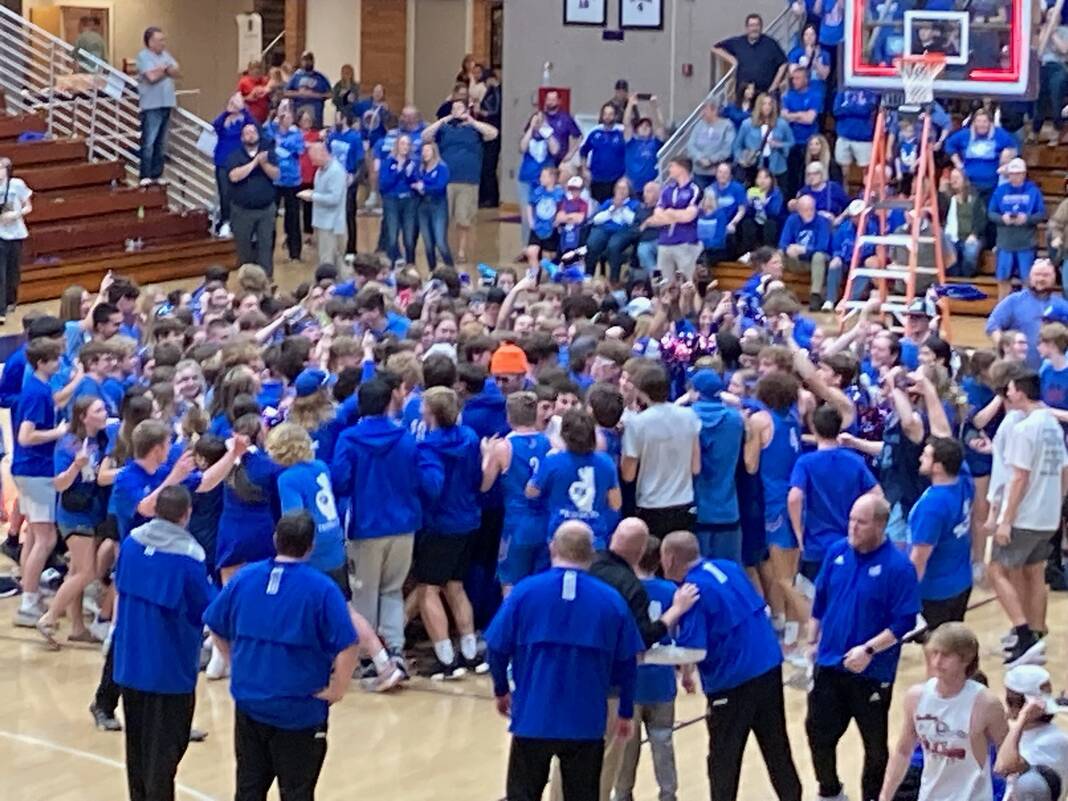 Fans, mostly dressed in blue, were lined up hundreds deep to get into Seymour’s Lloyd Scott Gymnasium a half-hour before doors opened a hour before the 7 p.m. tipoff. They filled an entire side and parts of the ends of the 8,000-plus seat venue.