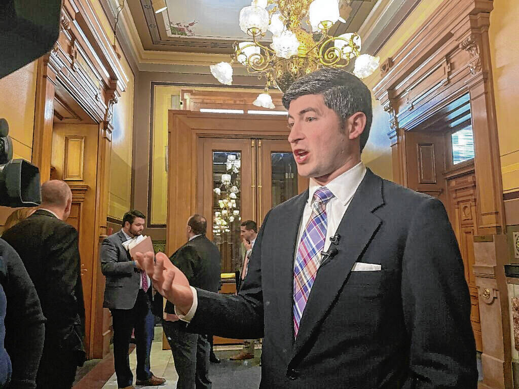 Rep. Timothy Wesco, R-Osceola, talks to reporters after a Senate committee hearing on his mail-in voter ID bill on Monday, March 6, 2023.