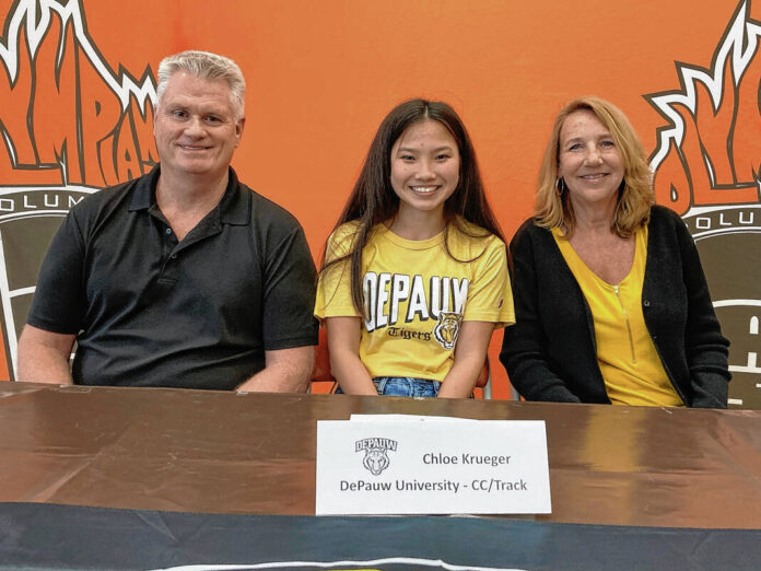 Columbus East senior Chloe Krueger signed to run cross-country and track at DePauw. She is joined by her parents Scott and Joleen Krueger.