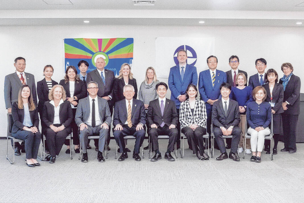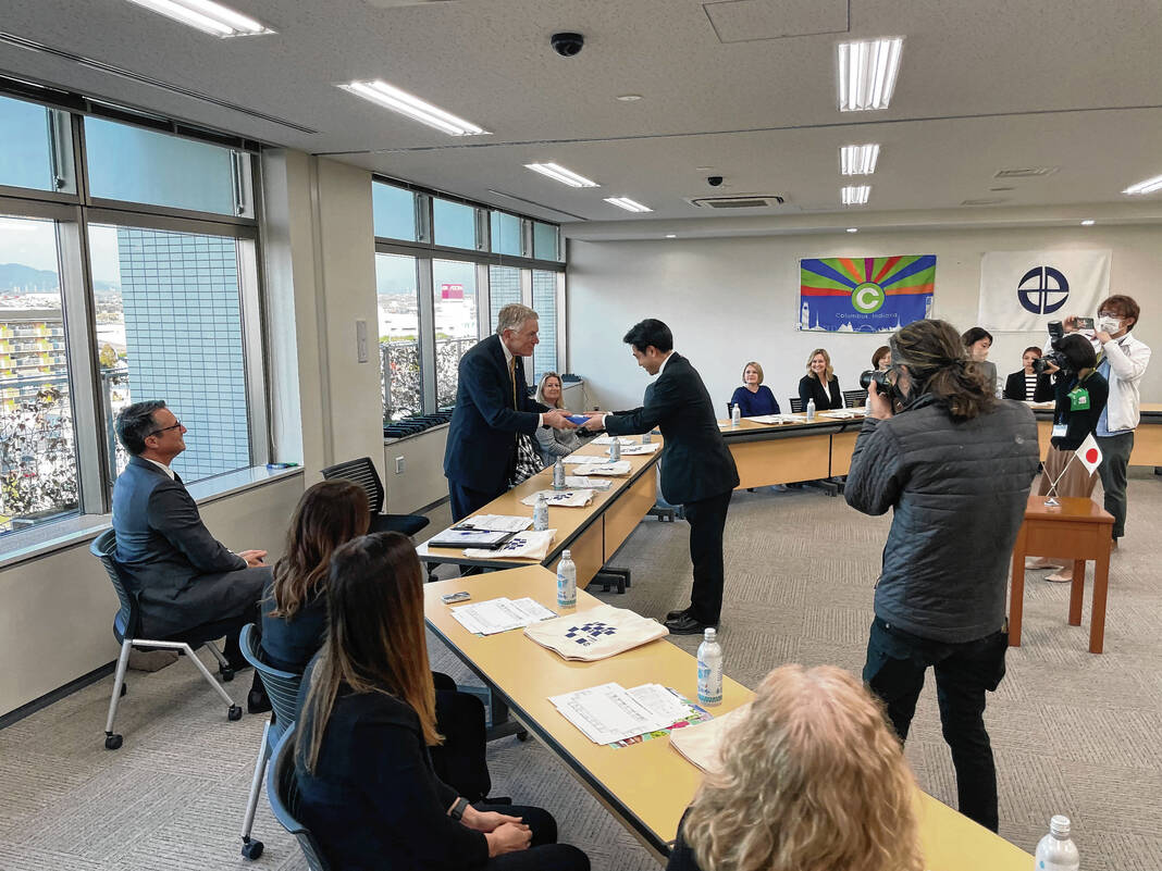 Photo provided Columbus Mayor Jim Lienhoop and other members of the delegation met the new mayor of Miyoshi, Tasuku Oyama, and other city officials.