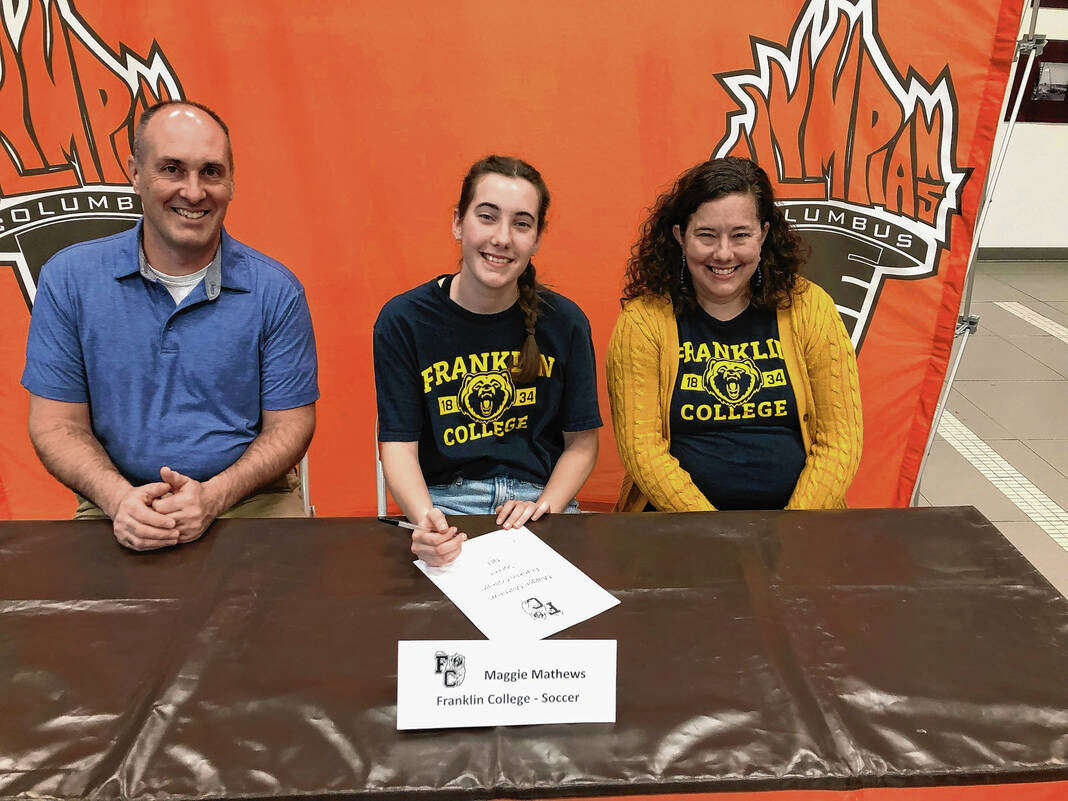 Columbus East senior Maggie Mathews participated in a signing ceremony Friday to play soccer at Franklin College. She is joined by her parents Zach and Megan Mathews.