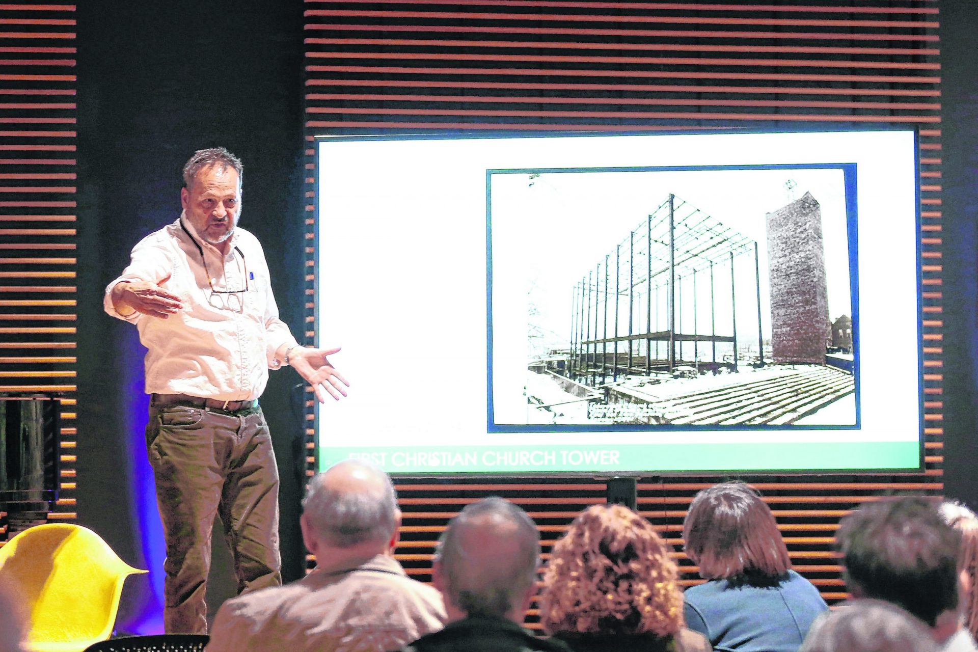 A detailed and humorous Joyner spoke Saturday to a group of 75 people at Helen Haddad Hall in downtown Columbus during another installment of Landmark Columbus Foundation’s ongoing Progressive Preservation series. Those attending ranged from Jeff Logston, chairman of the First Christian Capital Projects Fundraising Committee, to former Columbus Area Visitor Center tour guides who still love the structure to faculty from Indiana University’s J. Irwin Miller Architecture Program.