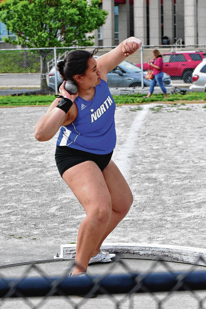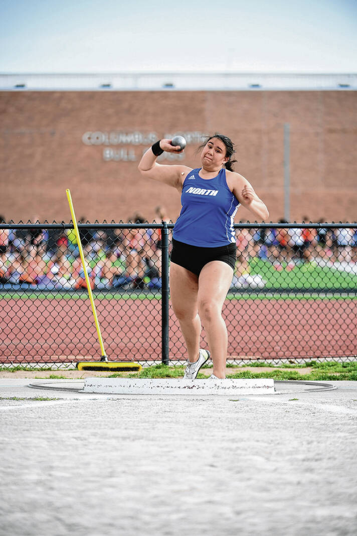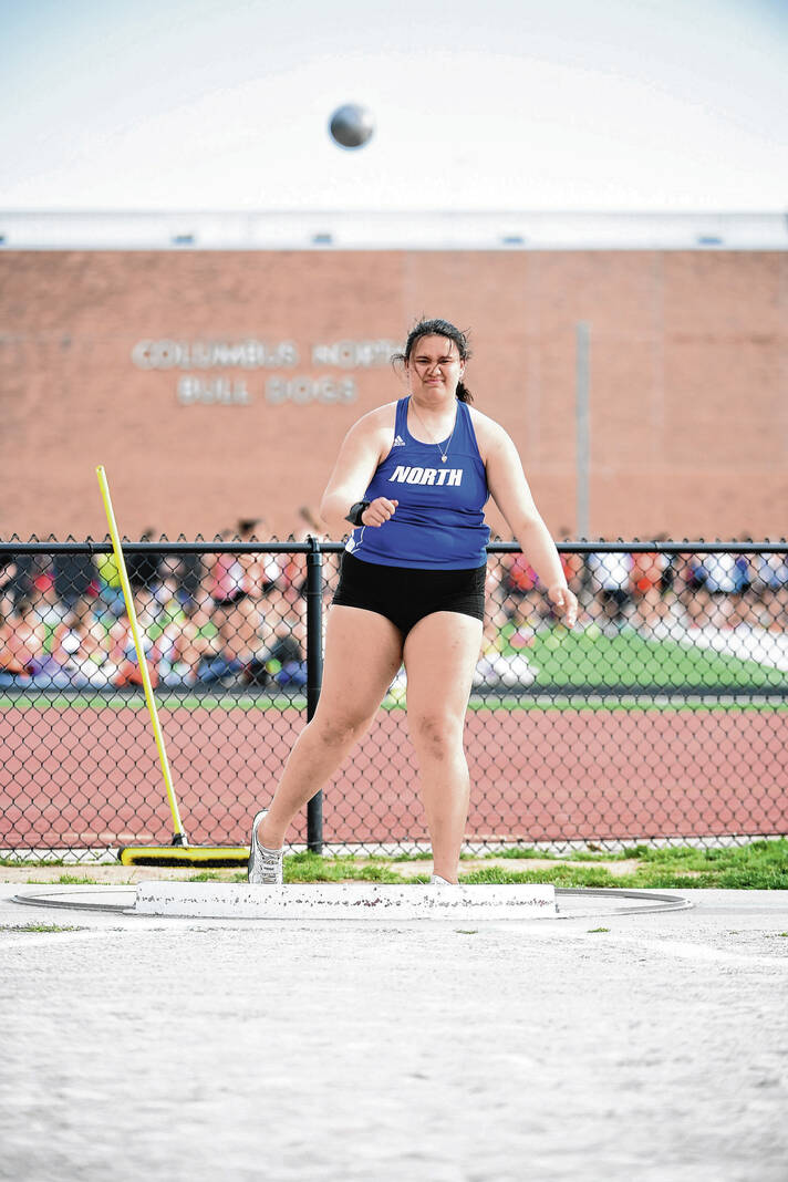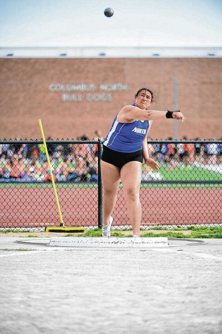 Columbus North’s Moana Steele watches her throw in the shot put during a meet against Columbus East Thursday at Columbus North High School.