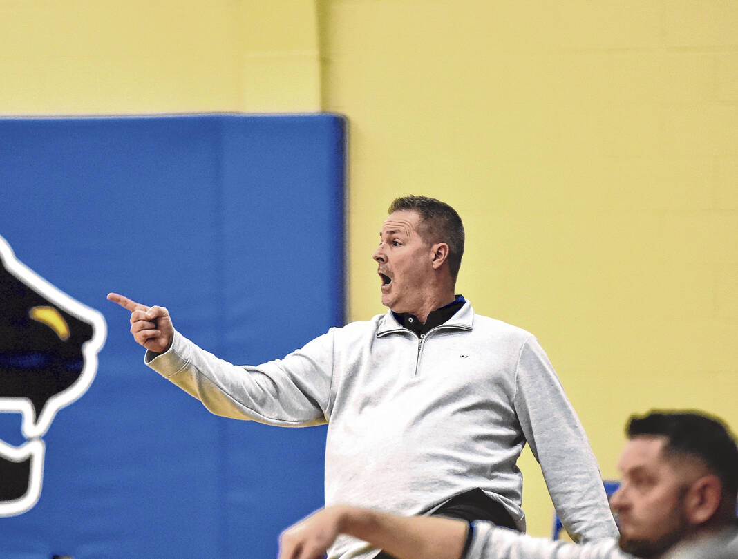 Trinity Lutheran girls basketball coach Mike Lang pleads his case to an official during a home game against Madison on Jan. 26. Lang is taking over as the Cougars’ boys basketball coach.