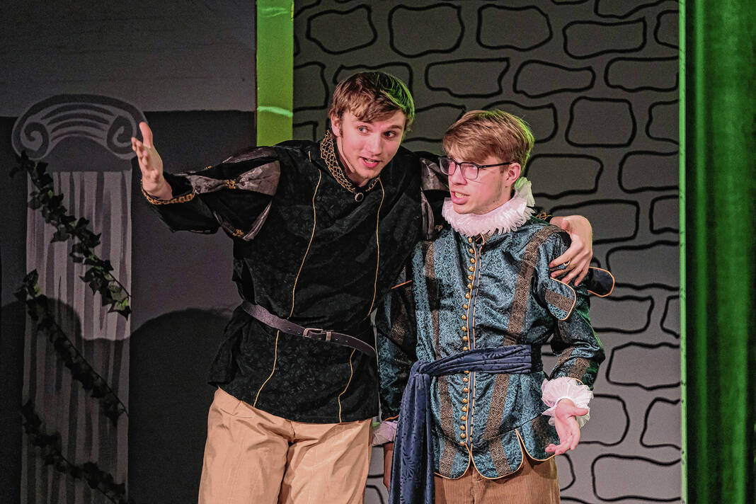 Jack Burbrink, left, as Benvolio, and Henry Ulrich, as Valentine, rehearse a scene for Columbus East’s production of “After Juliet” at Columbus East High School on April 18.
