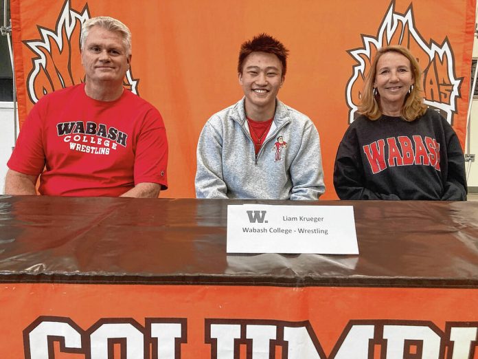 Columbus East senior Liam Krueger participated in a signing ceremony Monday to wrestle at Wabash College. He is joined by his parents Scott and Joleen Krueger.