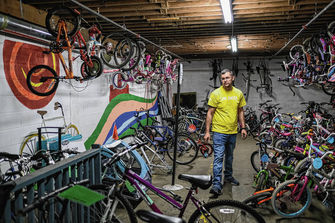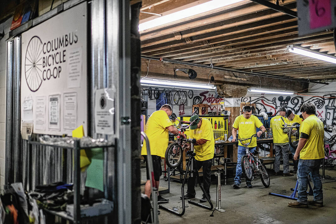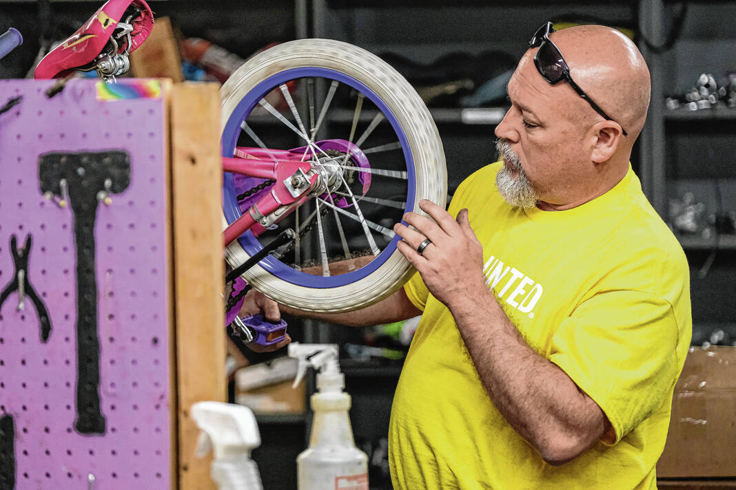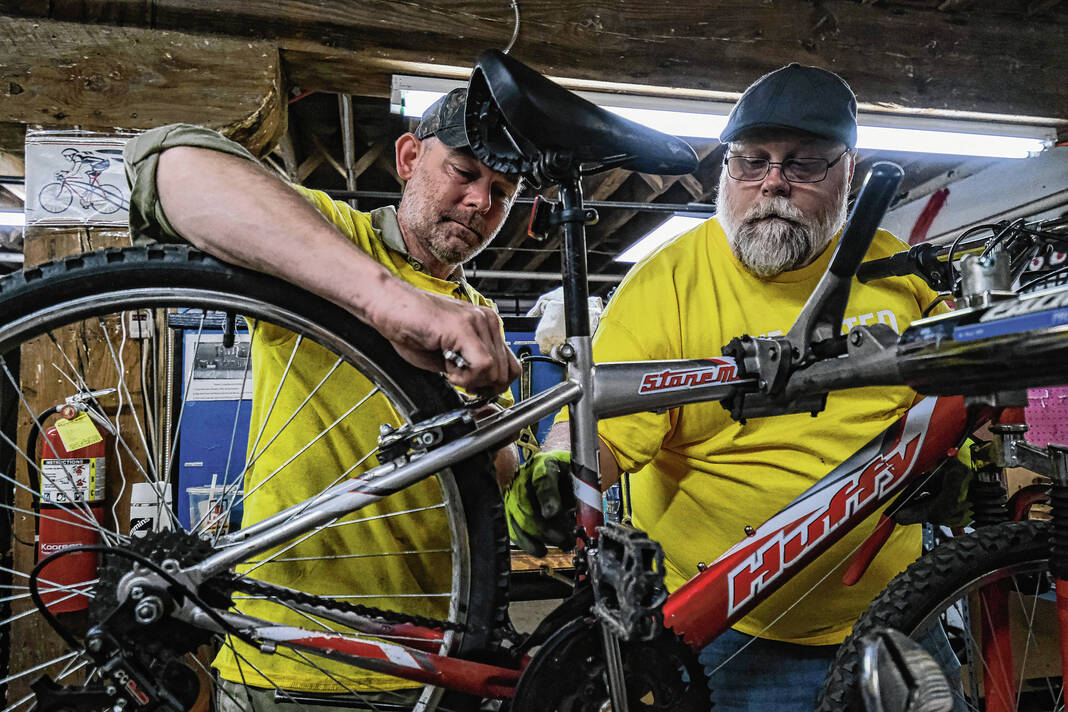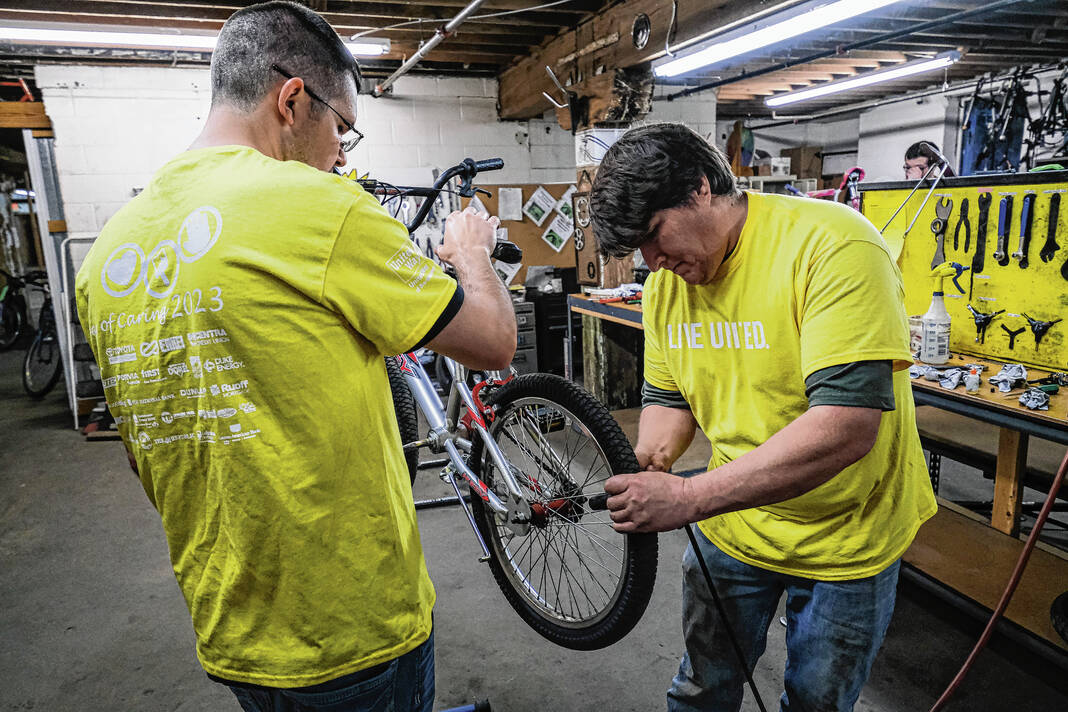 Mike Wolanin | The Republic Volunteers Todd Kaller, left, and David Jones repair a bicycle for the United Way Day of Caring at the Columbus Bike Co-op in Columbus, Ind., Friday, May 5, 2023.