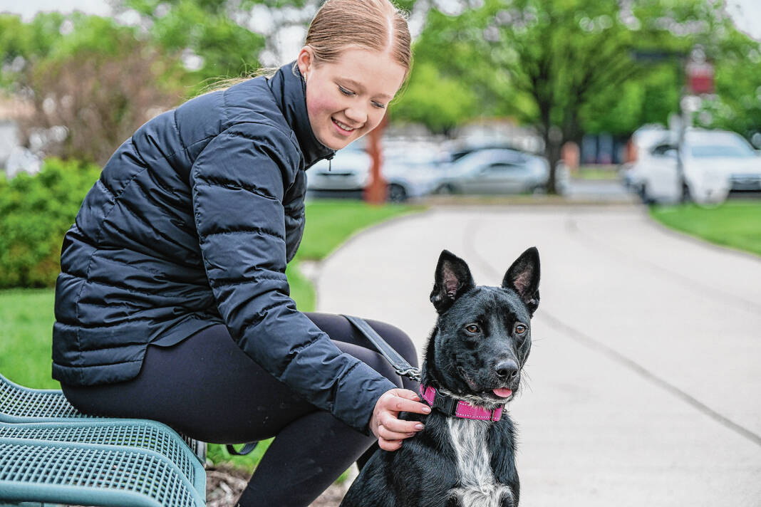 Mike Wolanin | The Republic Volunteer Siena Glover pets adoptable dog Tux during an event for students to pet and cuddle with adoptable dogs to de-stress during finals week at IUPUC in Columbus, Ind., Tuesday, April 25, 2023.