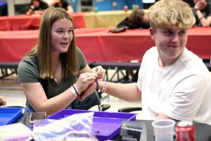 Natasha Armstrong helps Charlie Ashman put on the bead bracelet he made during the Turning Point’s 2023 After Prom Party event for freshmen and sophomores held at Central Middle School in Columbus, Ind., Saturday, May 6, 2023.