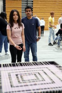 Jestly Ferrer and Juan Ferrer play the coin toss game during the Turning Point’s 2023 After Prom Party event for freshmen and sophomores held at Central Middle School in Columbus, Ind., Saturday, May 6, 2023.