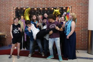 Students use the photo backdrop for a selfie during the Turning Point’s 2023 After Prom Party event for freshmen and sophomores held at Central Middle School in Columbus, Ind., Saturday, May 6, 2023.