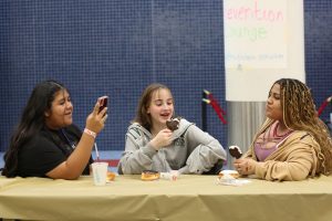 Araceli Ayala, Ali Fischvogt and Ronna Booker visit and eat ice cream during the Turning Point’s 2023 After Prom Party event for freshmen and sophomores held at Central Middle School in Columbus, Ind., Saturday, May 6, 2023.