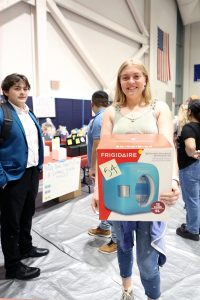 Emilie Beaver, at right, holds the retro beverage refrigerator she won during the Turning Point’s 2023 After Prom Party event for freshmen and sophomores held at Central Middle School in Columbus, Ind., Saturday, May 6, 2023.