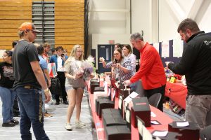 Students, at left, line up to claim prizes handed out by volunteers during the Turning Point’s 2023 After Prom Party event for freshmen and sophomores held at Central Middle School in Columbus, Ind., Saturday, May 6, 2023.